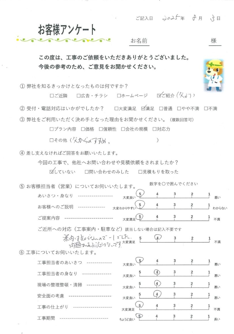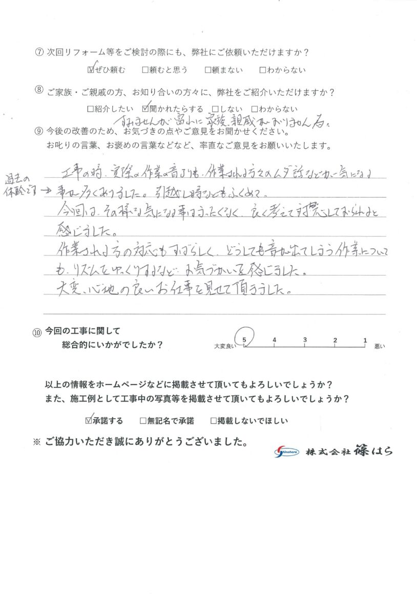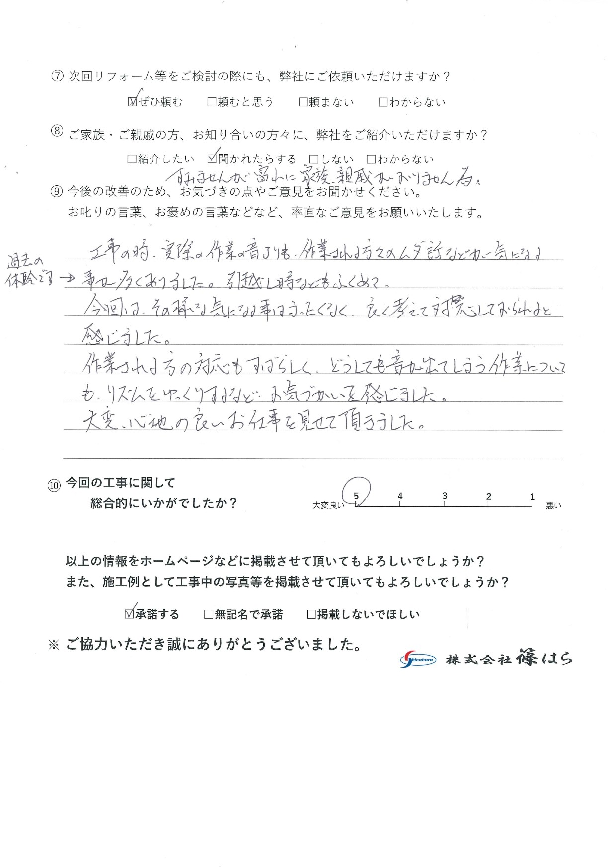 作業される方の対応もすばらしく、どうしても音が出てしまう作業についてもリズムをゆっくりするなど、お気づかいを感じました。